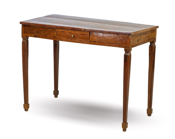 Tavolo scrittoio da centro lastronato in noce e legni vari ad un cassetto nella