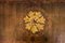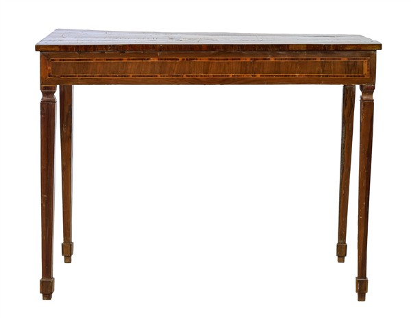 Tavolo scrittoio da centro lastronato in noce e legni vari ad un cassetto nella fascia, piano intarsiato al centro da rosone, gambe a obelisco rovesciato. Inizio secolo XIX (cm 100x77x55) (difetti e restauri)