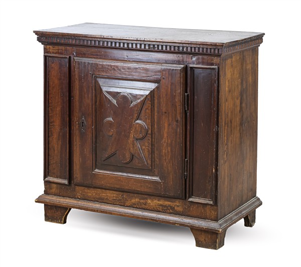 Stipo in legni vari con fronte a un'anta bugnata a motivo geometrico, piano con bordura dentellata, piedi a mensola. Mobile realizzato con elementi antichi (cm 98x90x47,5) (difetti)