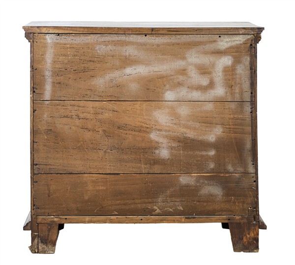 Stipo in legni vari con fronte a un'anta bugnata a motivo geometrico, piano con