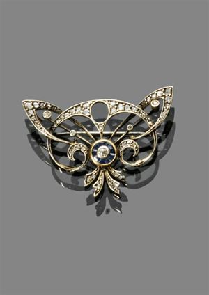 SPILLA Spilla a doppio uso in oro e argento a forma di farfalla stilizzata con diamantini vecchio taglio per complessivi ct 0,15 ca , zaffirini taglio carré e diamante centrale taglio vecchio Peso gr 7,50 Epoca Liberty Butterfly shaped, dual purpose pin in gold and silver with antique cut diamonds that equal 0,15 kt, ascher cut sapphire and old style cut center diamond. weight 7.5 gr liberty period