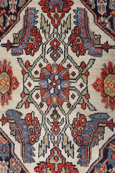 Tappeto galleria Hamadan, Persia, secolo XX. Decoro con tre medaglioni con puntali a fondo bianco e rosso su campo blu notte inserito in un fondo rosso cosparso di rami fioriti. Bordura Herati su fondo bianco (cm 605x201) (difetti)