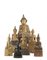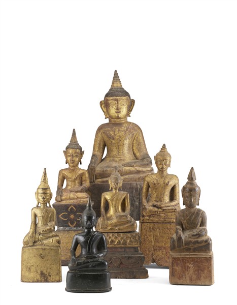 A collection of seven sculptures depicting Buddhas in prayer, six of which are carved and gilded wood, joined to one in burnished bronze. Burma, 19th century (maximum height 35 cm) (defects and losses)