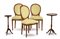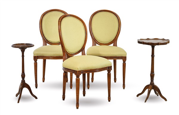 Lotto composto da tre sedie in stile Luigi XVI e due tavolini di diversa forma