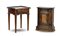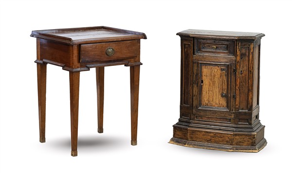 Lotto composto da un tavolino ad un cassetto sottopiano con gambe rastremate e un mobiletto ad un cassetto ed un anta ricavato da antico inginocchiatoio (cm max 58x77x50) (difetti e mancanze)