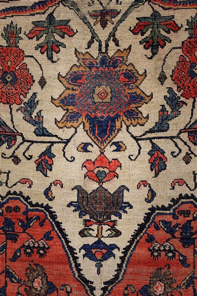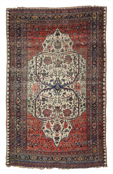 Tappeto Bidjiar, Persia, inizio secolo XX. Campo decorato con una grande riserva bianca ornata da due draghi stilizzati che avvolgono rami fioriti, rose Kadjiar e melograni. Angolari ornati da rami fioriti a fondo rosso. Molteplici bordure, la principale con motivo Herati su fondo blu, l'esterna a fondo bianco con architetture (cm 440x286) (difetti, mancanze e rapature)