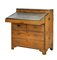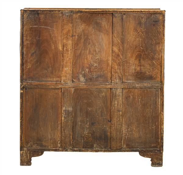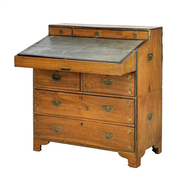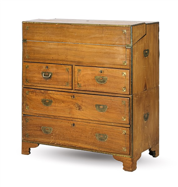Comò in mogano a due corpi filettato in ottone con maniglie laterali, parte inferiore a due cassetti e parte superiore a due cassettini e piano ribaltabile celante scrittoio, vani e tre cassettini. Inghilterra, secolo XIX (cm 89,5x97,5x46,5) (difetti)