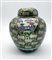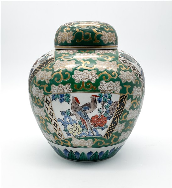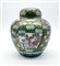 Potiche con coperchio in porcellana dipinta in policromia a fondo verde con dor