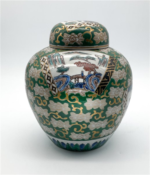Potiche con coperchio in porcellana dipinta in policromia a fondo verde con dorature e scene con paesaggi naturalistici ed animali entro cartigli