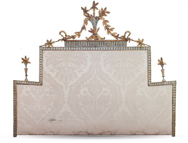 Testiera da letto legno intagliato, laccato e dorato con profili dentellati e cimasa traforata a racemi vegetali. Secolo XIX. Riserva rivestita in tessuto (cm 183x158) (difetti e restauri)