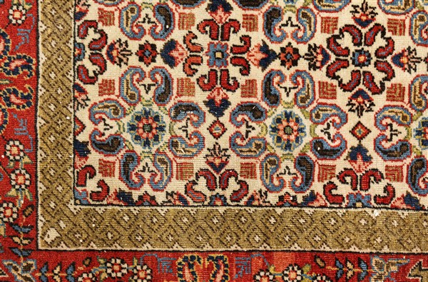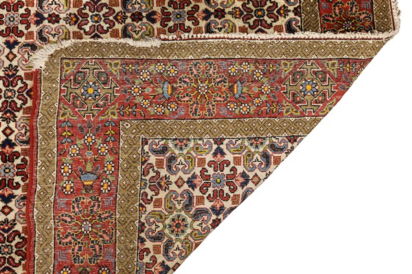 Tappeto Qum, Persia, secolo XX. Decoro Herati policromo su fondo bianco. Bordura con vasi fioriti e rosette su fondo rosso (cm 202x139) (difetti, mancanze e rotture)