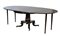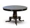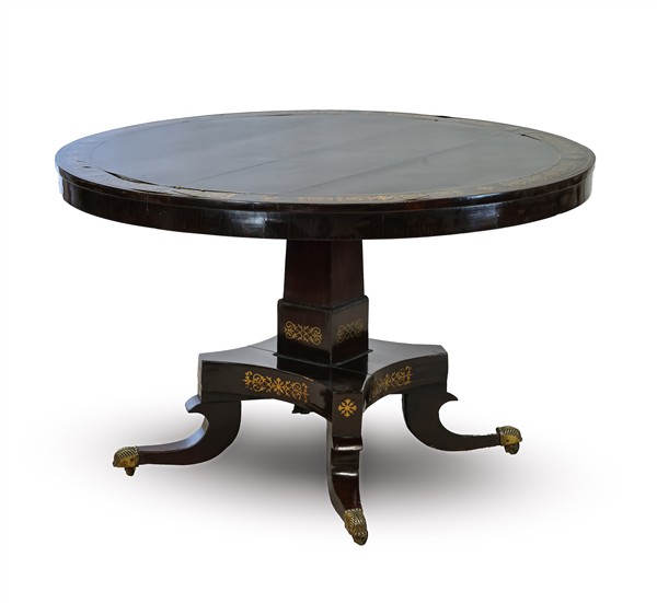 Tavolo a vela impiallacciato in mogano e intarsiato in ottone, piano circolare con fascia decorata a motivi stilizzati, sostegno squadrato con gambe a volute su ruotine. Secolo XIX (d cm 121, h cm 77) dotato di due allunghi con quattro gambe d'epoca successiva (L cm 123 cad.) (difetti)
