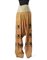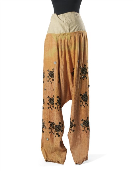 Ensemble of trousers and skirt made for a theatrical performance with apricot damask silk applications enriched by applications of dark brown floral embroidery and small round mirrors probably in silver.
