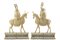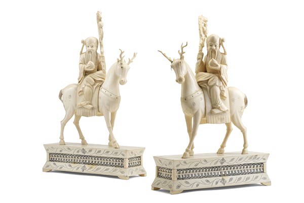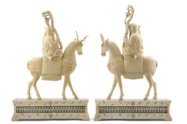 Coppia di intagli in avorio raffiguranti Immortali a cavallo di un cervo, su base con decori geometrici e stilizzati