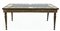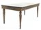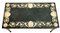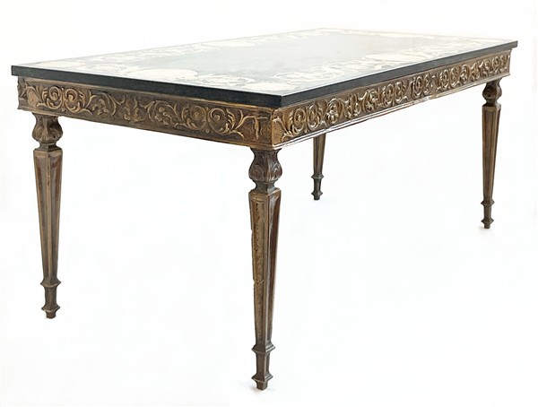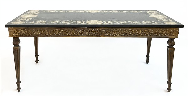 Piano in scagliola con bordura decorata da girali di foglie e fiori alternati da quattro profili entro cartigli, angoli a rosoni. Sostegno in metallo dorato con fascia a volute fogliate e gambe ad obelisco rovesciato (cm 56x110x47,5) (difetti)