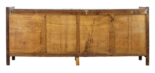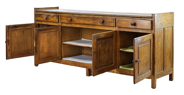 Credenza in legni vari con fronte a quattro sportelli pannellati e tre cassetti con pomoli torniti, fondi in compensato (cm 220x92x55) (difetti e mancanze)