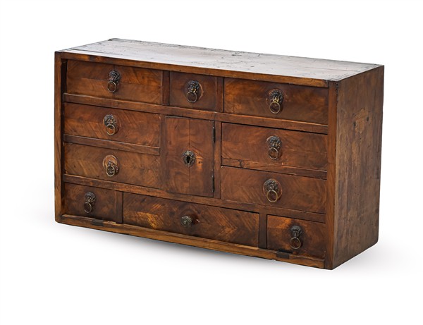 Monetiere in legni vari con fronte a sette diversi cassetti e antina centrale con sistemi di bloccaggio interni. Inizio secolo XIX (cm 79x45x27) (difetti)