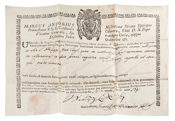 Accompanied by a printed document with some manuscript parts issued by Cardinal Marcantonio Colonna (1724-1793) vicar general of Pope Pius VI. The document certifies that the relic of San Filippo Neri is authentic and worthy of veneration, with manuscript dating "die 6 mensis Julii, anno domini 1791" with handwritten signatures (defects and tears)