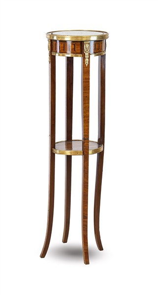 Alzata a due ripiani lastronata in legni vari, profili in bronzo dorato, fascia intarsiata a motivi stilizzati, gambe rastremate. Piano in marmo incassato (h cm 102; d cm 27,5) (difetti)