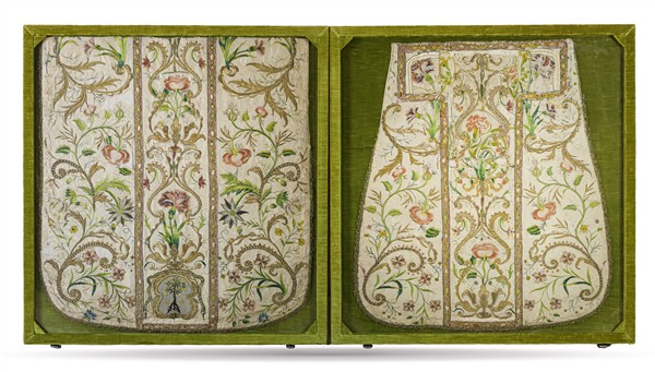Teca rivestita in velluto verde contenente la parte anteriore ed il frammento di una parte posteriore di una pianeta confezionata con tessuto in seta ricamato in seta a punto lanciato e decorata da applicazioni in argento dorato di manifattura ligure del secolo XVIII-XIX. Stemma araldico alla base della parte posteriore della pianeta (stoffa cm max 80x73) (difetti, mancanze e vecchi restauri)