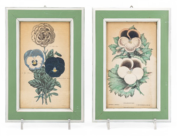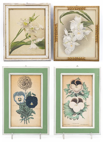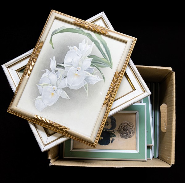 Cartone contenente numerose litografie di diverse misure raffiguranti fiori e studi botanici (cm max 28x21) entro cornici laccate (difetti)