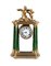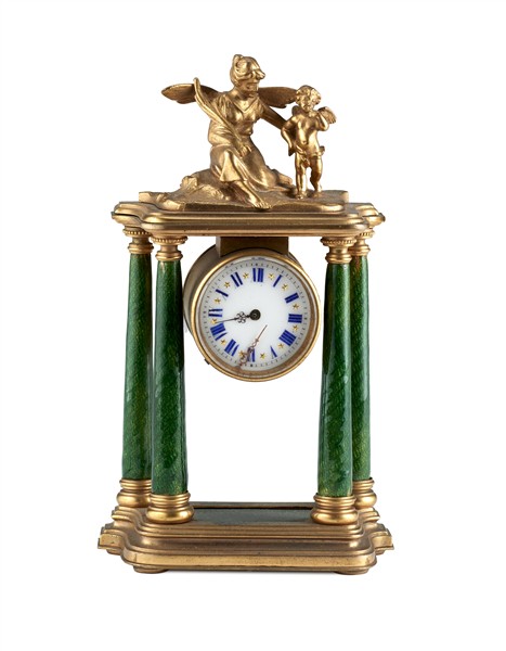Orologio a portico in metallo dorato con colonne in smalto verde sormontato da soggetto allegorico. Quadrante a numeri romani, movimento solo tempo. Fine secolo XIX-inizio secolo XX (h. cm 13) (difetti e chiave di regolazione mancante)