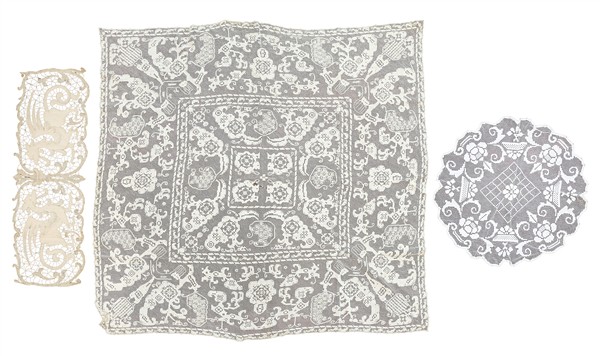 Lotto composto da numerosi pizzi e centrotavola al tombolo e all'uncinetto (difetti e macchie)
