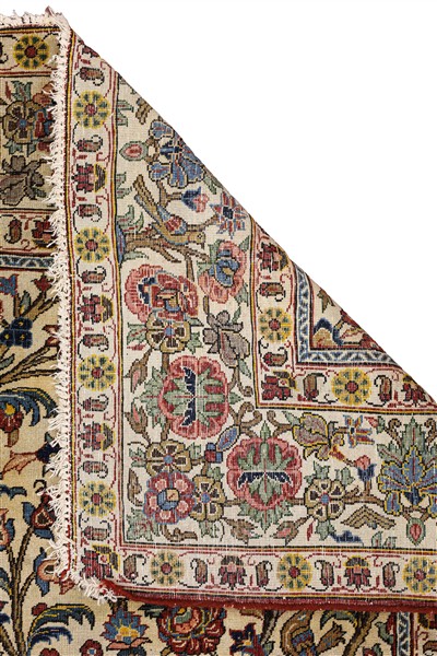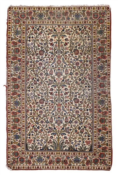 Tappeto Qum Shakeri, Persia, secolo XX. Decoro in stile William Morris con Alberi della Vita fioriti che si intersecano a creare volute e riserve su fondo bianco. Bordura a meandro con rose Kadjiar e volatili (cm 204x133) (difetti, rapature, mancanze e rotture)