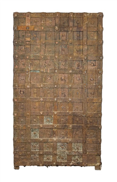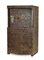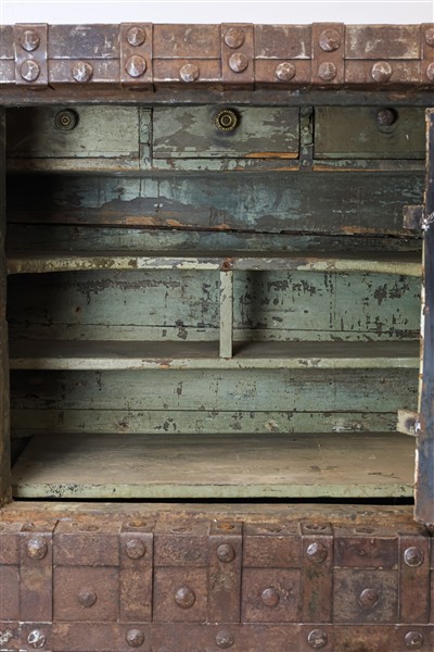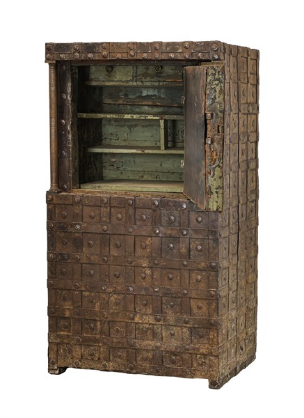 Cassaforte in legno interamente rivestito in ferro borchiato, parte superiore con sportello dotato di doppia chiave originale tra colonne. Scarabattolo con scomparti, tiretti e vano nella parte inferiore. Secolo XIX (cm 79x141x55) (difetti)