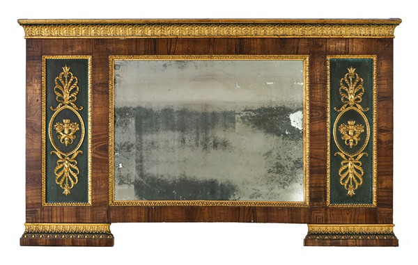 Caminiera in legno dipinto e dorato con specchio rettangolare e lesene decorate a palmette e motivi floreali in pastiglia dorata su fondo laccato verde, bordure dipinte a finto legno e dorate. Inizio secolo XIX. Etichetta "Ongaro Antichità, Milano" al retro (cm 136x81) (difetti)