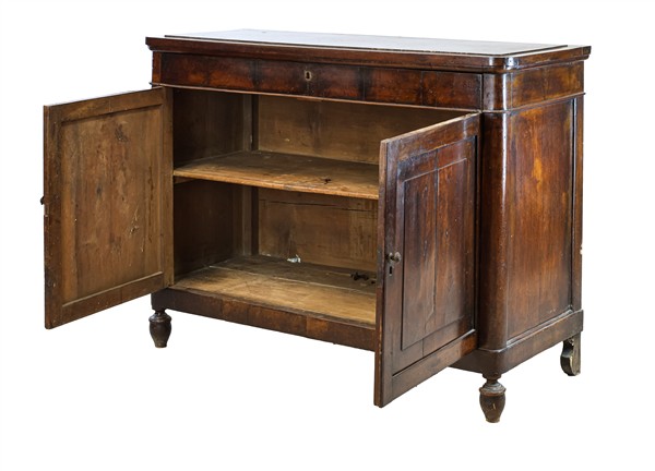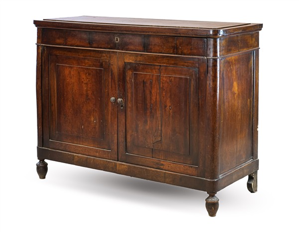 Credenza a doppio sportello pannellato e cassetto sottopiano, piedi anteriori torniti. Secolo XIX (cm 135x103x56) (difetti)