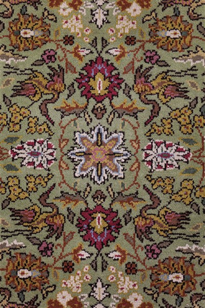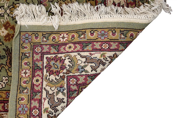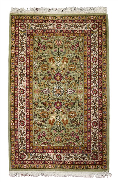 Tappeto Sparta, Anatolia, secolo XX. Decoro all over con rami fioriti e volatili policromi su fondo verde reseda. Molteplici bordure, la principale a fondo bianco con cerbiatti e fiori (cm 163x105) (difetti)