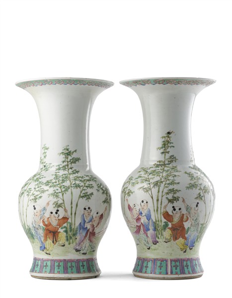 Coppia di vasi a balaustro in porcellana Famiglia Rosa decorati da figure di fanciulli entro paesaggio naturale.