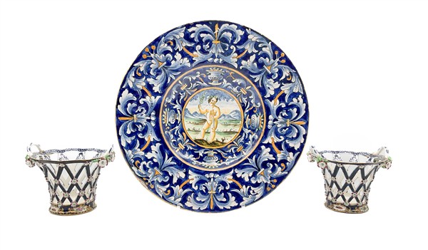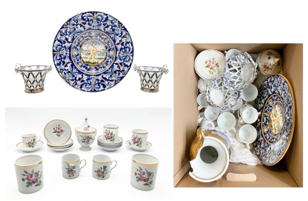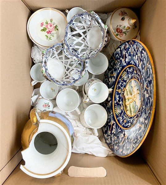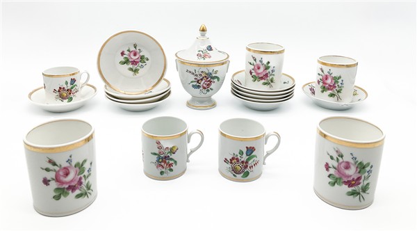 Manifattura Ginori, Doccia, inizio secolo XIX. Gruppo di sei tazze da caffè con piattino ed una zuccheriera con coperchio porcellana dipinta in policromia col decoro del mazzetto di fiori e bordi dorati e alcune tazze cilindriche con piatto di simile decoro; unite a un vaso piriforme in porcellana dipinta in policromia e oro con scena con figura entro un paesaggio (rotture), un piatto in maiolica dipinta e coppia di piccole cestine inglesi traforate in porcellana dipinta blu, in policromia e dorata, modellate con fiori e foglie (h cm 12) (difetti)
