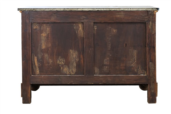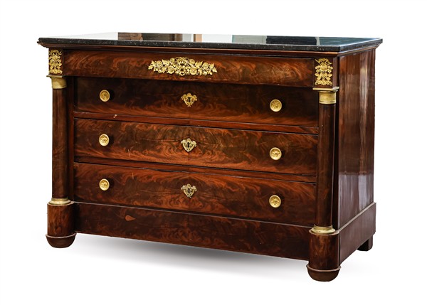 Cassettone Impero in mogano e piuma di mogano con fronte a quattro cassetti di cui uno aggettante sottopiano, montanti a colonna, fregi e capitelli in bronzo dorato e piano in marmo nero del Belgio. Francia, secolo XIX (cm 130x89,5x61) (difetti e restauri)