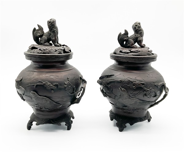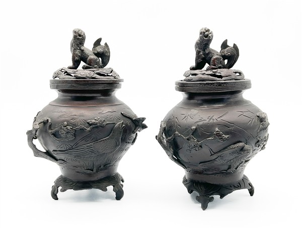 Coppia di incensieri con coperchi in bronzo inciso e traforato. Giappone, seco