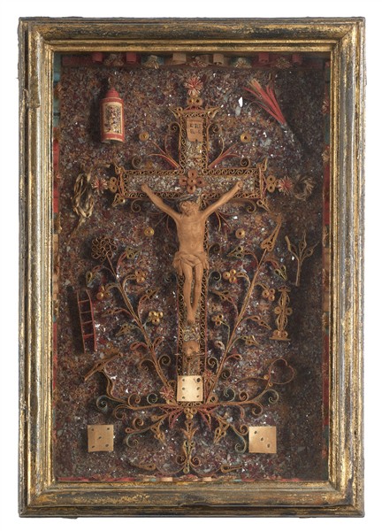 Arte del secolo XVIII-XIX. Ex voto con Cristo Crocifisso in legno e paperolle,