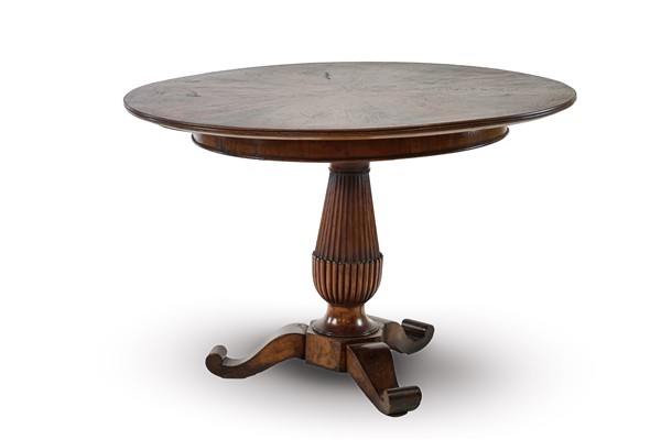 Tavolo con piano circolare in legni vari, sostegno baccellato e scanalato su tripode (d cm 118, h cm 79) (difetti e restauri)
