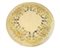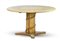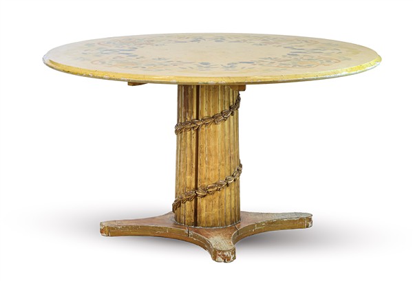 Tavolo di forma tonda con piano in agglomerato dipinto in policromia a fiori e motivi vegetali, gamba centrale a colonna scanalata in legno dorato e intagliato a corolla di foglie su base sagomata (h cm 81; d cm 144) (difetti)