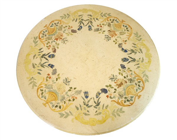 Tavolo di forma tonda con piano in agglomerato dipinto in policromia a fiori e