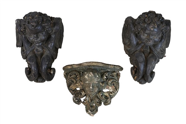 Lotto composto da coppia di antiche mensole in legno intagliato ed ebanizzato a volto di cherubino e una mensola in stucco dorato con volto di cherubino tra volute fogliate (cm max 30x50) (difetti)