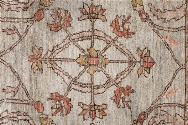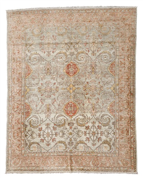 Tappeto Azeri, Caucaso, secolo XX. Decoro all over floreale policromo di ispirazione Safavide su fondo verde acquamarina. Bordura con decoro stilizzato su fondo rosa pallido (cm 280x240) (difetti)