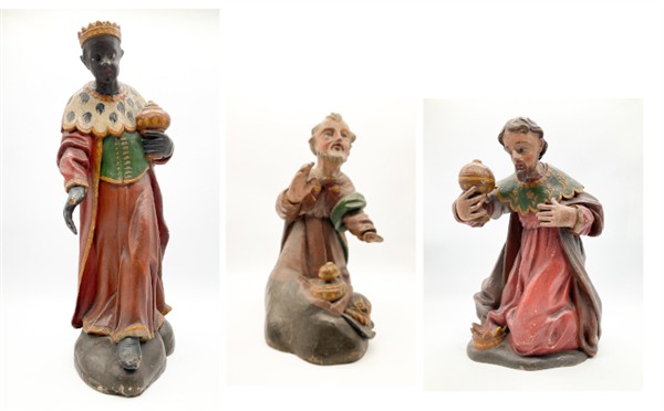 Arte del secolo XIX. Tre figure presepiali dei Re Magi in legno intagliato e di