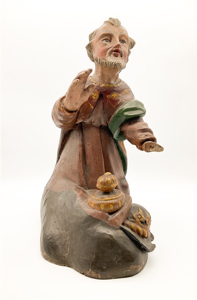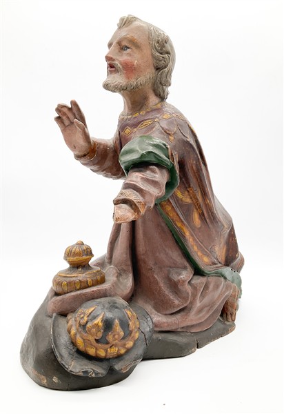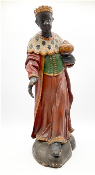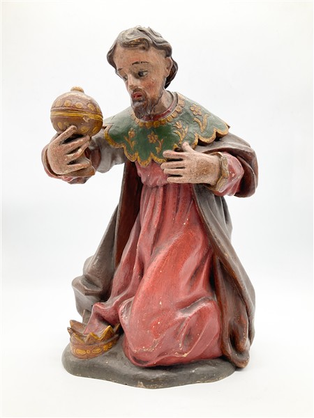 Arte del secolo XIX. Tre figure presepiali dei Re Magi in legno intagliato e dipinto in policromia (h max cm 58) (difetti e mancanze)