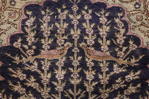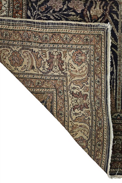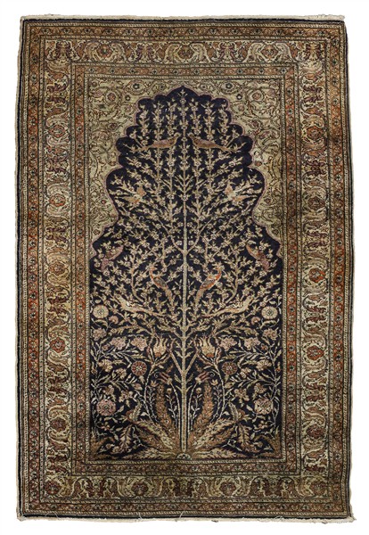 Tappeto preghiera Kaiseri, Anatolia, secolo XX. Annodato in cotone mercerizzato. Mirab a fondo marrone scuro decorato con Albero della Vita, fiori e volatili. Bordura a meandro su fondo bianco (cm 182x125) (difetti)