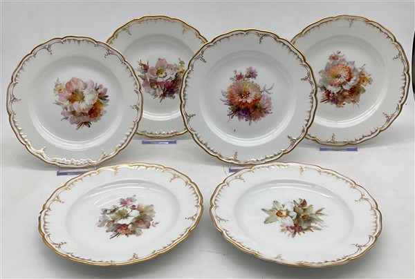 Manifattura KPM, Berlino, fine secolo XIX. Gruppo di sei piatti in porcellana decorata a fiori in policromia nel cavetto e profilo dorato (d cm 21) (difetti)