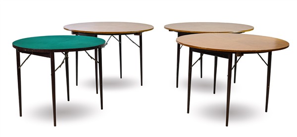 Gruppo di quattro tavolini da gioco con piano circolare in panno verde e gambe pieghevoli (d cm 90 h cm 73) uniti a tre piani sovrapponibili (d cm 110) (difetti)