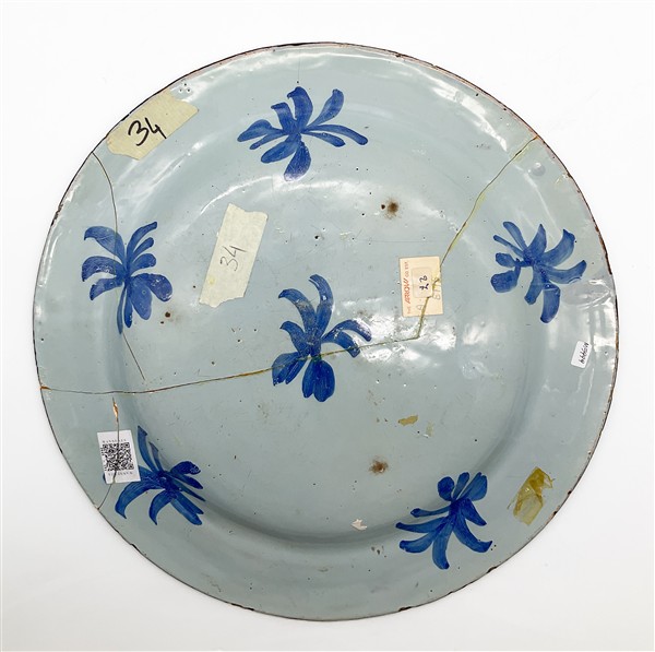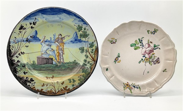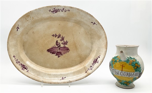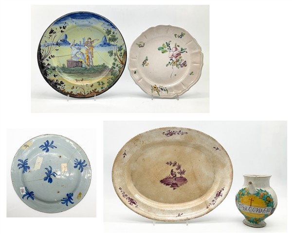 Manifatture diverse, secolo XVII-XVIII. Lotto composto da un orciolo in maiolica dipinta in policromia con corolla e cartiglio con iscrizione del contenuto, Deruta (h cm 17), un piatto con decoro floreale (d cm 32,5), un piatto in maiolica dipinta a paesaggio con figure, Pavia (d cm 37) e un vassoio in terraglia dipinta in porpora a volatili di epoca successiva (cm 41,5x33) (difetti e restauri)