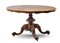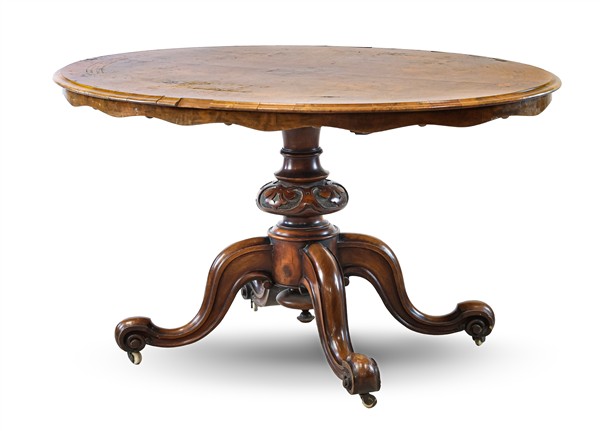 Tavolino da centro con piano ovale impiallacciato in radica di noce e filettato in legni chiari, sostegno a balaustro su quattro gambe mosse terminanti a ricciolo, con ruotine. Secolo XIX (cm 137x73x99) (difetti e mancanza)