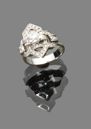 ANELLO Anello in oro bianco con diamante vecchio taglio di ct 0,70 ca e diamanti per ct 0,60 ca Peso 7,20 white gold ring with antique cut center diamond 6,70 kt surrounded by diamonds totaling about 0,60 kt weight 7.20 gr.